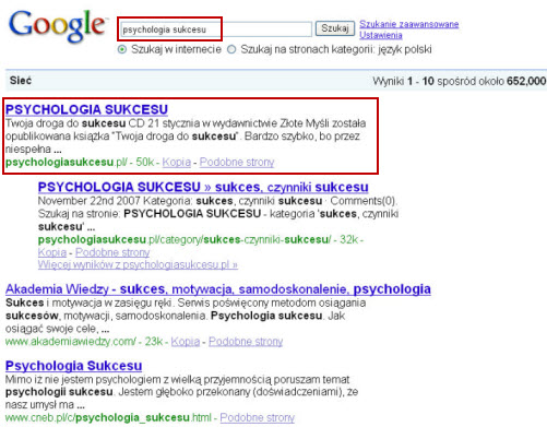 Właścicielem serwisu, który jest na pierwszym miejscu w google gdy wpisze się hasło "psychologia suckesu" jest Arkadiusz Podlaski, autor publikacji "Pierwsze miejsce w wyszukiwarkach". Stosuje on swoją wiedzę w praktyce, czego rezultatem jest to, że jego strony znajdują się wysoko w wynikach wyszukiwania.